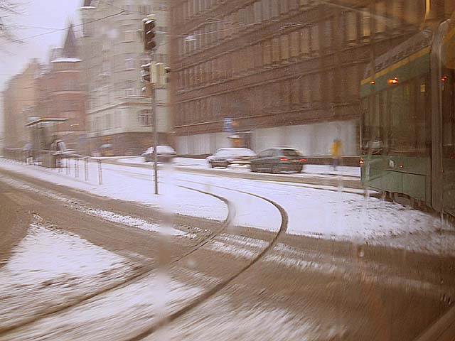 Helsinki: Räntäsateinen Satamakatu nähtynä ratikan ikkunasta.