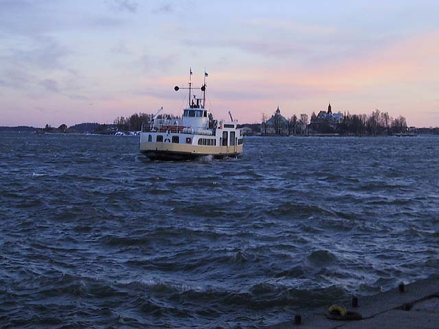 Helsinki: Suomenlinnan lautta lähestyy Kauppatoria jäätävässä tuulessa.