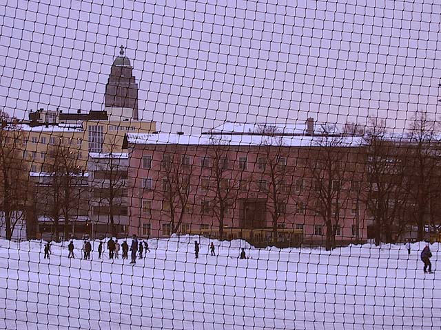 Helsinki: Luistelua Kallion urheilukentällä, taustalla Kallion kirkko.