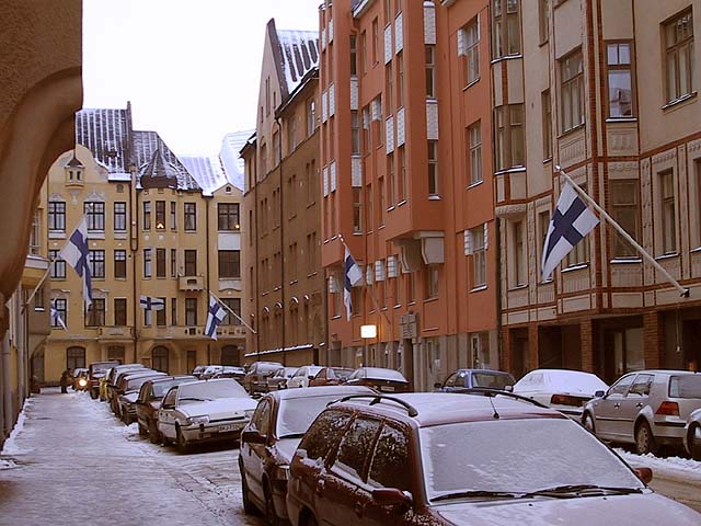 Helsinki: Itsenäisyyspäivän lippumeri Luotsikadulla Katajanokalla.