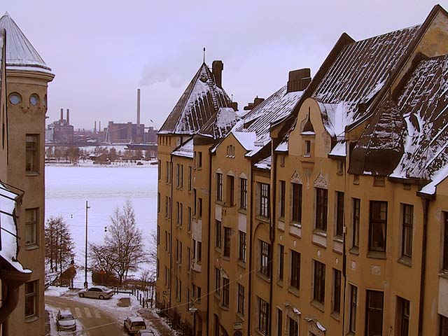 Helsinki: Näkymä pitkin Vyökatua Katajanokalla. Taustalla Tervasaari ja Hanasaaren voimalaitos.