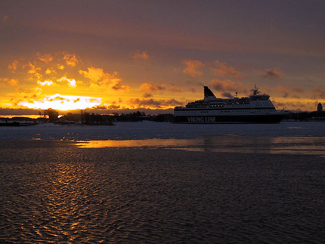 Helsinki: M/S Gabriella ohittaa Suomenlinnan uuden päivän sarastaessa.