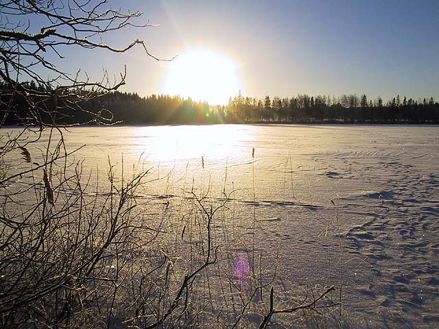Karkkila: Aurinko valaisee jäätynyttä, lumen peittämää Ali-Paastonjärveä.