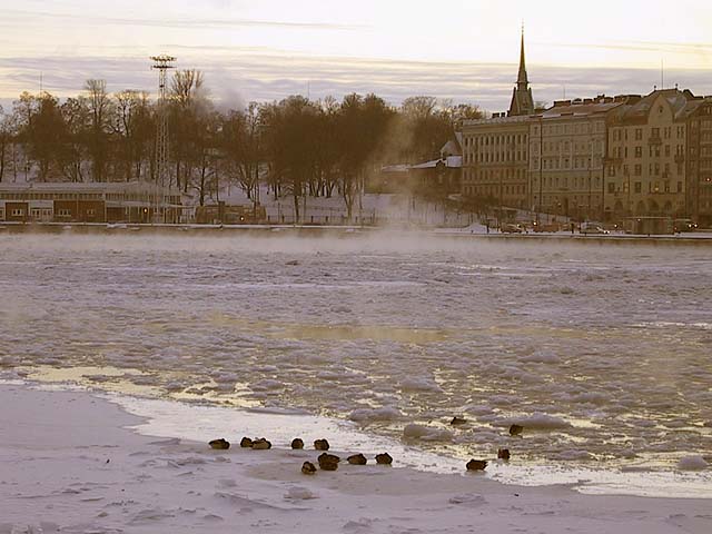 Helsinki: Sorsia Eteläsataman jäissä. Meri höyryää kovassa pakkasessa.