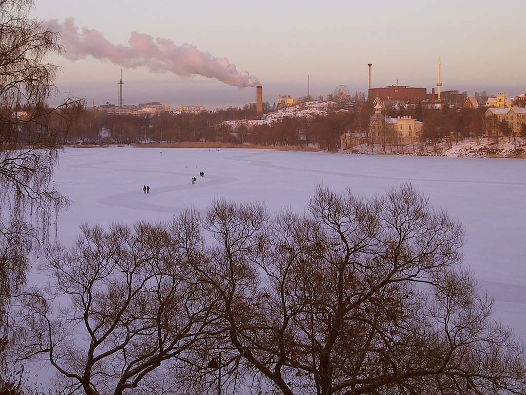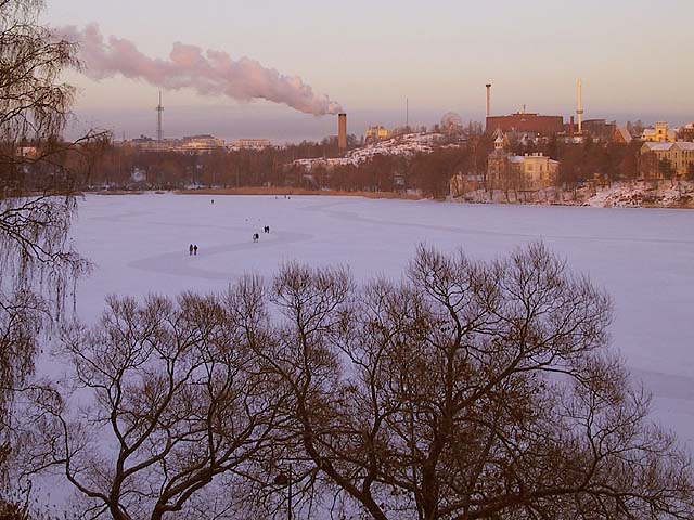 Helsinki: Kävelijöitä Töölönlahden jäällä, taustalla Linnanmäki. (Vertaa 1.10.2003.)