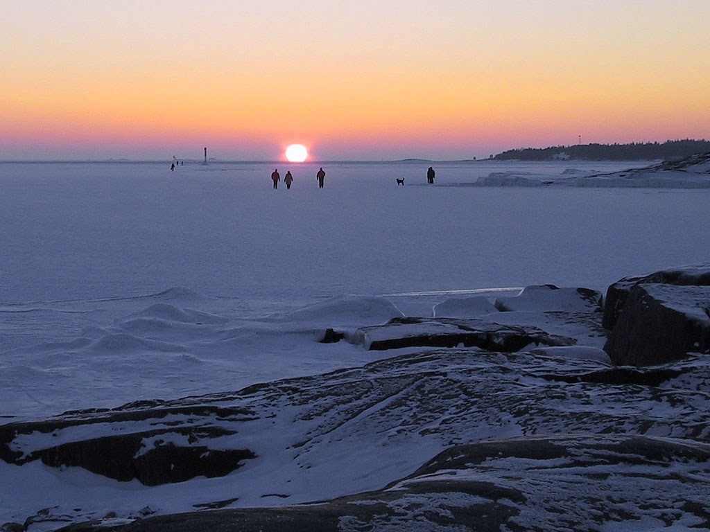 Helsinki: Auringonlasku Kaivopuiston edustalla kuvattuna Eteläisestä Uunisaaresta. Takana oikealla Pihlajasaari.