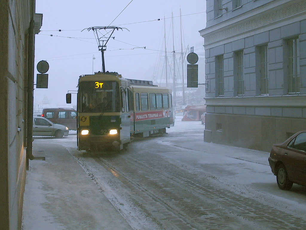 Helsinki: Raitiovaunu kääntyy Katariinankadulle iltapäivän lumituiskussa.