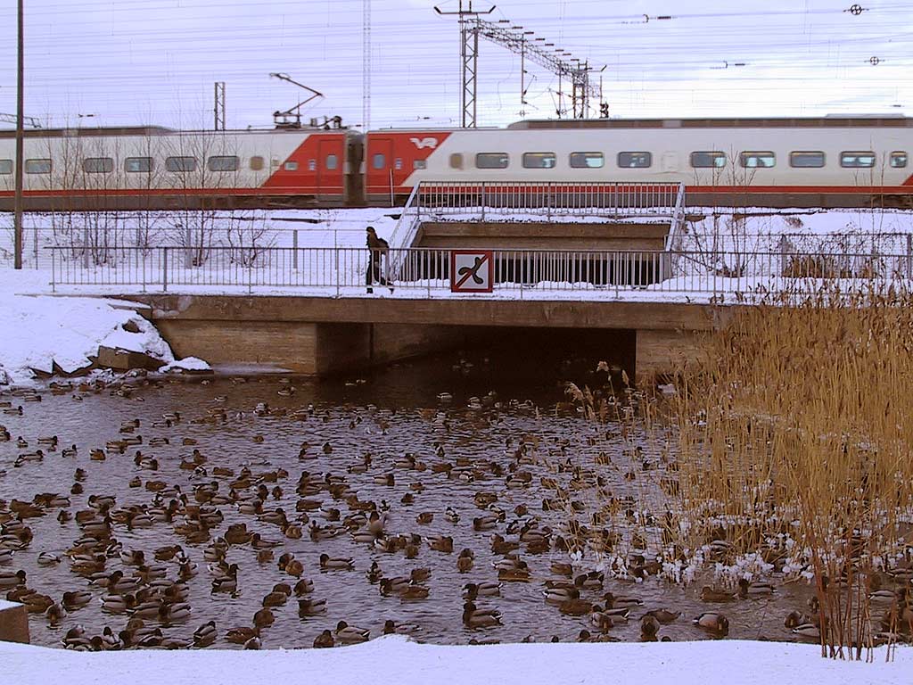 Helsinki: Sorsien ruokintapaikka Tokoinrannassa ja Pendolino-juna.