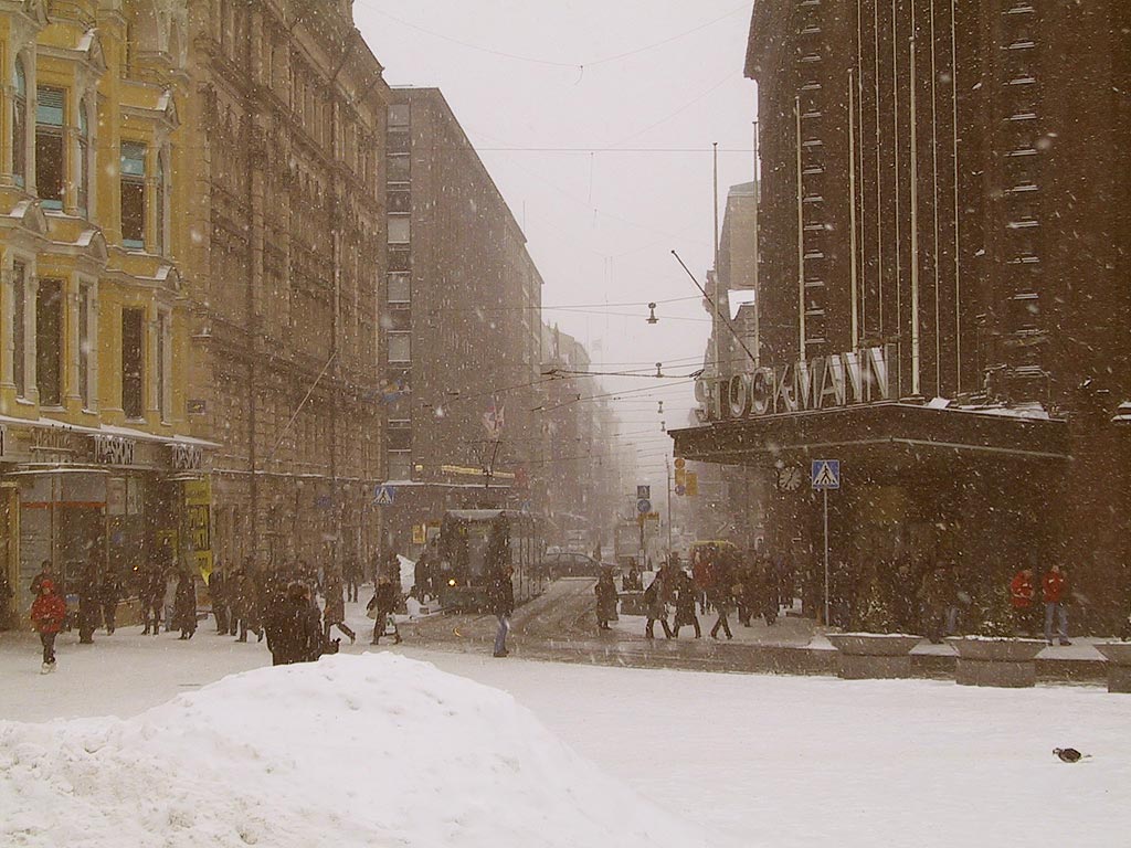 Helsinki: Aleksanterinkatu lumisateessa, näkymä Kolmen sepän aukiolta.