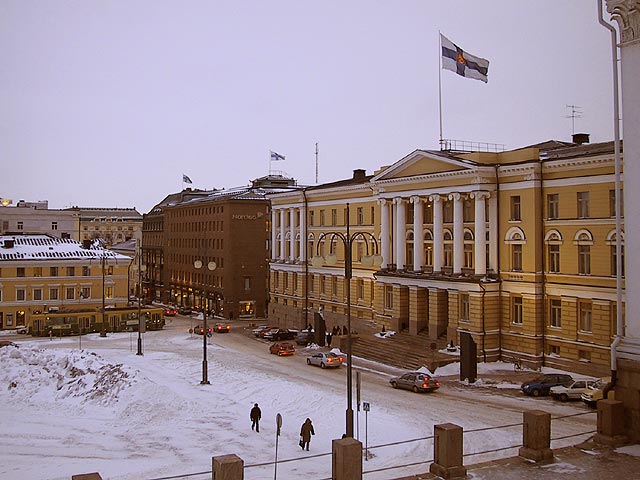 Helsinki: Luminen Senaatintori ja yliopiston päärakennus Runebergin päivänä.