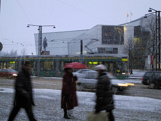 Helsinki: Tiheää räntäsadetta keskustassa nykytaiteen museon Kiasman edessä.