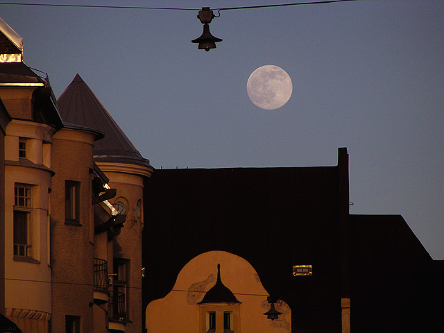 Helsinki: Nouseva täysikuu Luotsikadun itäpäädyn yllä hieman ennen auringonlaskua.