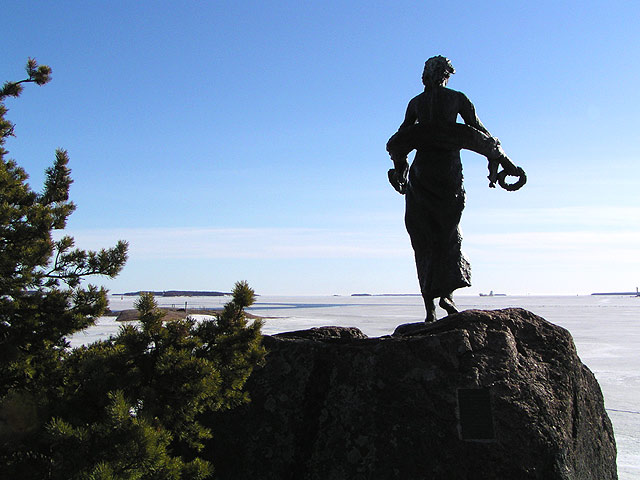 Kotka: Veistos Kuusisen saaren rannassa kirkkaana kevätpäivänä.