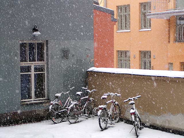 Helsinki: Takatalvi yllätti pyöräilijätkin; Katajanokan Luotsikatu 16 ja 18.