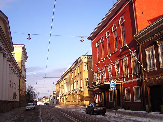 Helsinki: Aleksanterinkadun itäpää kylpee ilta-auringon lämpimässä valossa.