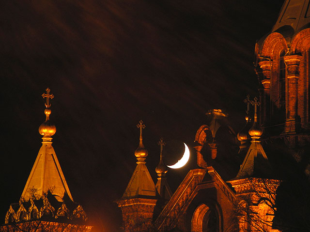 Helsinki: Kasvava kuunsirppi laskussa Uspenskin katedraalin tornien välissä.
