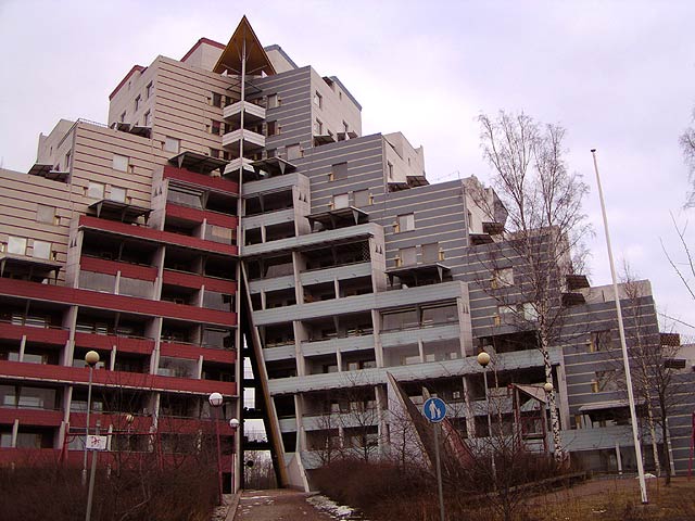 Helsinki: Pikku-Huopalahden maamerkki; terassitalo Punamäenpolulla.