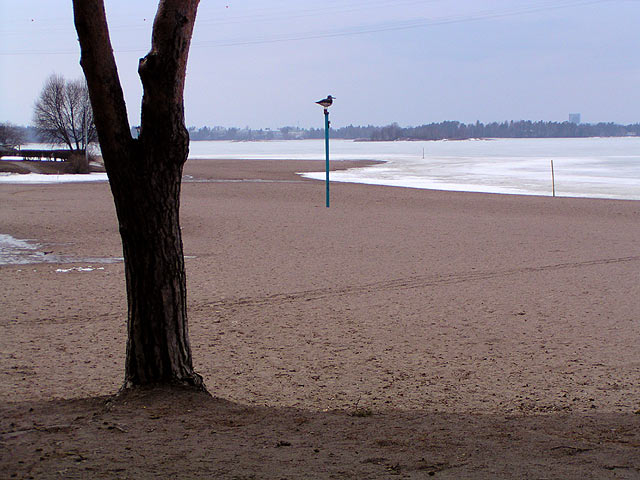 Helsinki: Jää ja viileä sää hallitsevat yhä Hietaniemen autiota uimarantaa.