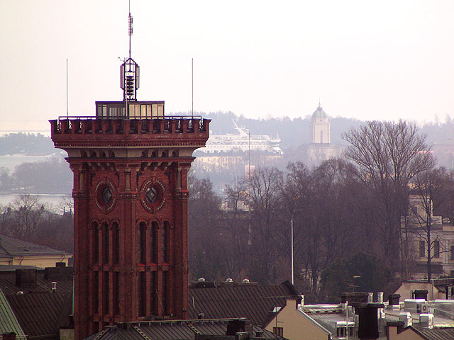 Helsinki: Erottajan paloaseman torni kuvattuna hotelli Tornin kattoterassilta Kampista. Taustalla näkyy Suomenlinnan kirkko/majakka.