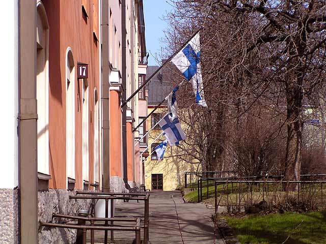 Helsinki: Näkymä Torkkelinkadulta Kalliosta kansallisena veteraanipäivänä.