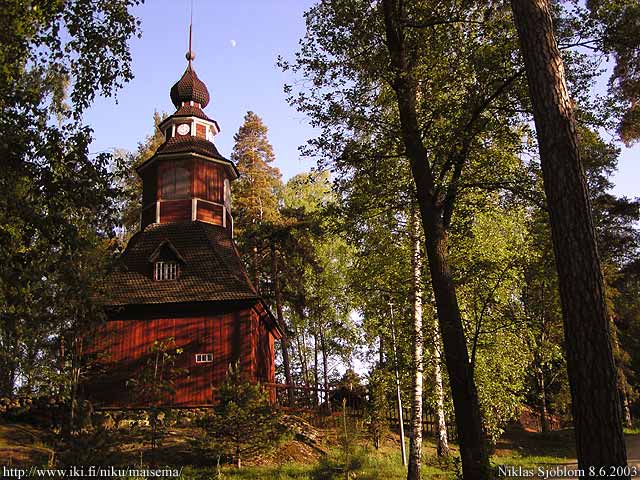 Helsinki: Karunan kirkon kellotorni Seurasaaren ulkomuseossa ja puolikuu.