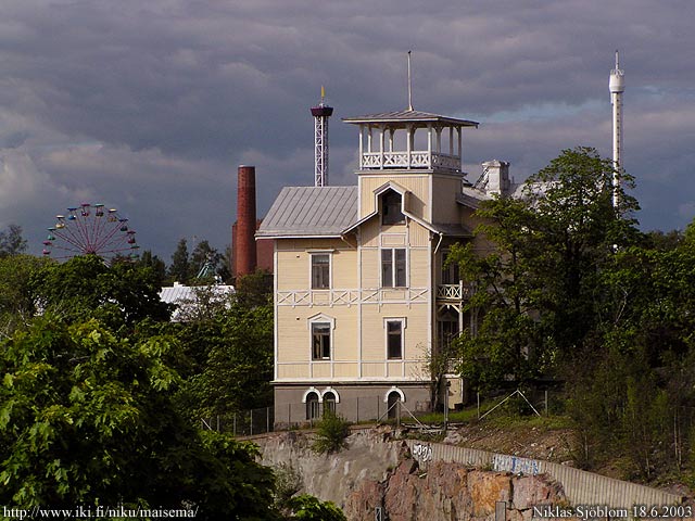 Helsinki: Yksi Eläintarhan huviloista rautatieasemalle johtavan ratakuilun itäpuolella Kalliossa. Taustalla näkyy Linnanmäki.