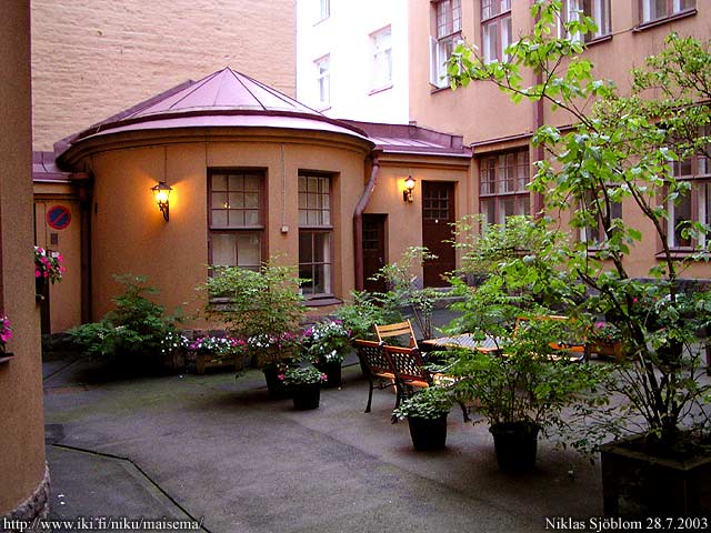 Helsinki: Meritullinkatu 12 Kruununhaassa; sisäpiha iltavalaistuksessa.