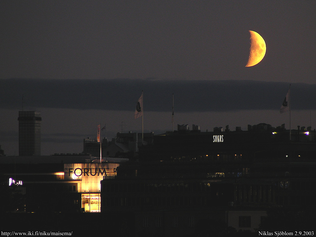 Helsinki: Kasvava puolikuu laskussa kaupungin keskustan yllä.