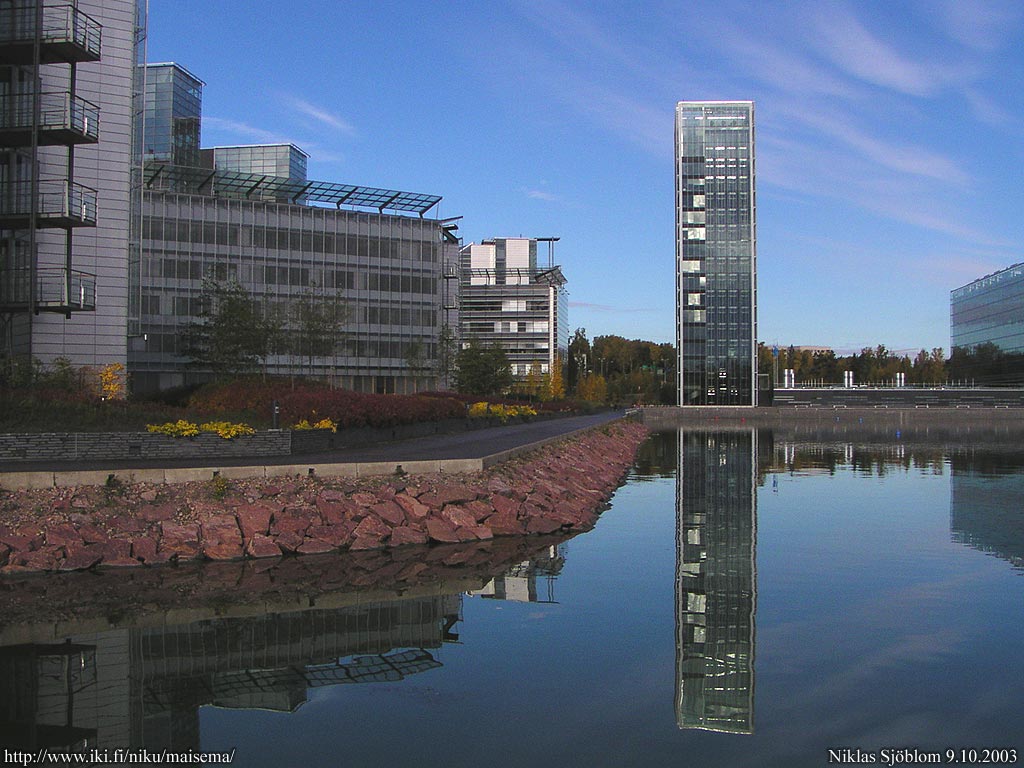 Espoo: Maisemapääkonttoreita Keilalahden rannassa (Nokia, Kone, Radiolinja).