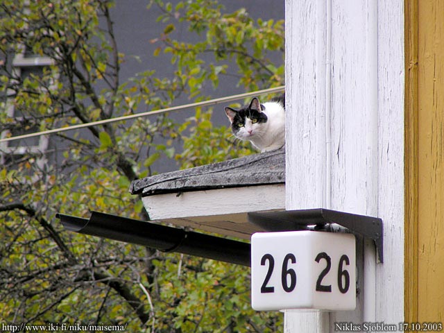 Helsinki: Valppaat silmät tarkkailevat ohikulkijaa Tapiolantiellä Käpylässä.