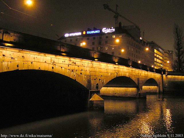 Helsinki: Valaistu Pitkäsilta (valm. 1912) pommitusjälkineen vuodelta 1918.