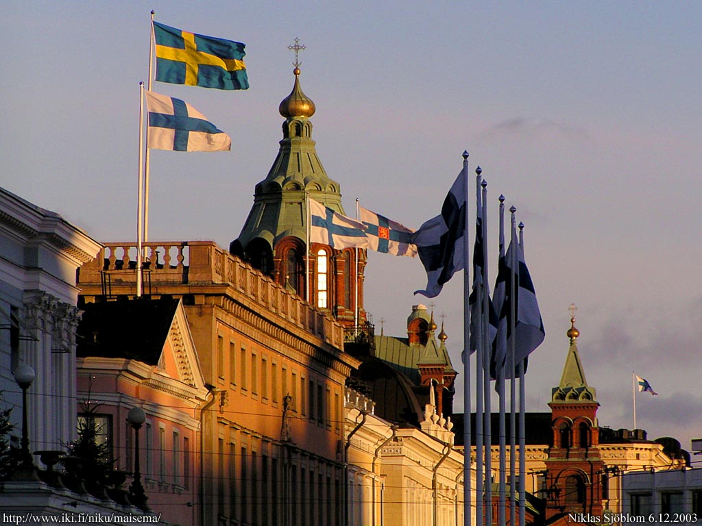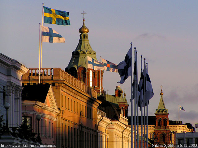 Helsinki: Suomen ja Ruotsin liput liehuvat Pohjoisesplanadilla aurinkoisena itsenäisyyspäivänä. Taustalla näkyy Uspenskin katedraali Katajanokalla.