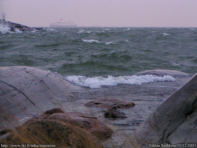 Helsinki: Kovan lounaistuulen aiheuttamaa merenkäyntiä kuvattuna Eteläisestä Uunisaaresta Kaivopuiston edustalta. (Vrt. 20.11.2003, 5.1.2004 ja 20.11.2004.)