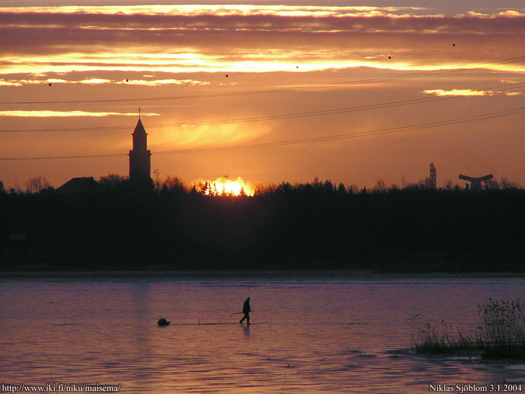 Helsinki: Pilkkijä Seurasaarenselän aamuauringossa; taustalla Hietaniemi.