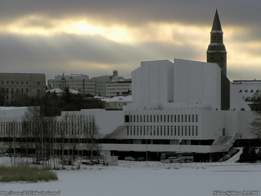 Helsinki: Finlandia-talo Töölönlahden rannalla, takana m.m. kansallismuseo.