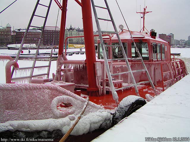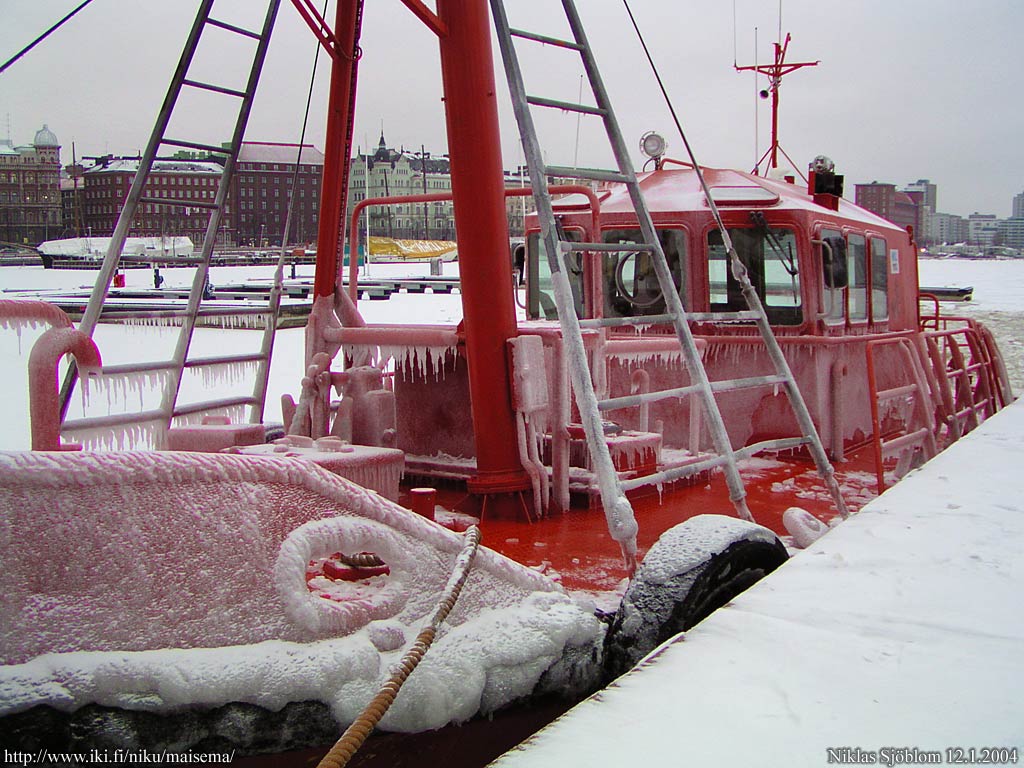 Helsinki: Jään peittämä luotsivene laiturissa Katajanokan pohjoispuolella.