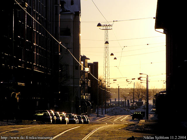 Helsinki: Kruunuvuorenkatu Katajanokalla kylmän aamun auringonpaisteessa.