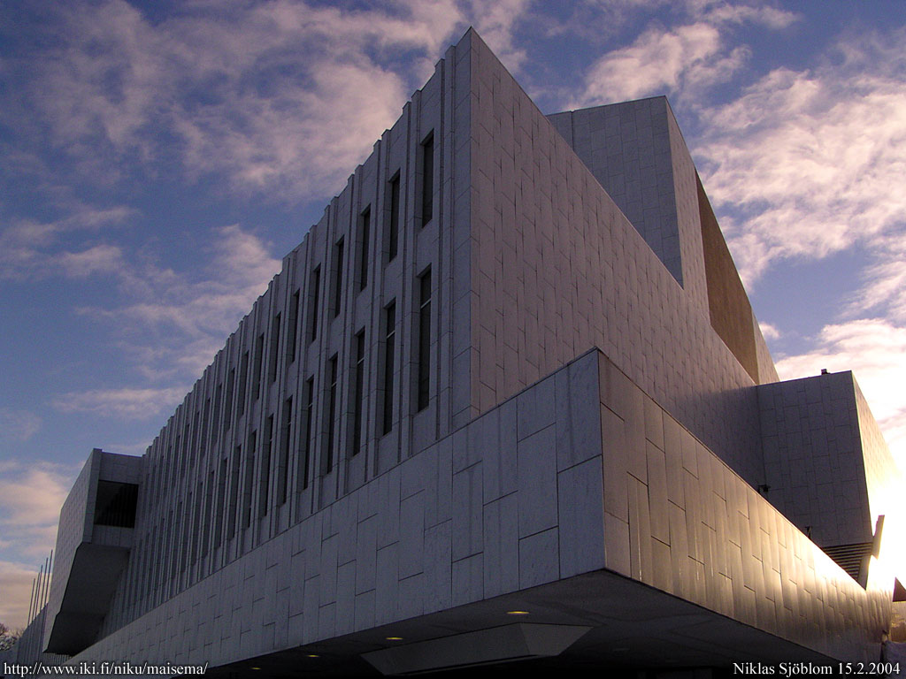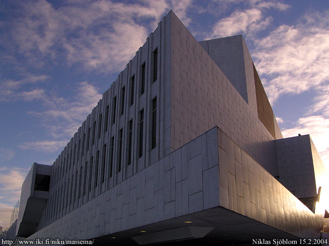 Helsinki: Finlandia-talo ja hälvenevät pilvet kaupungin yllä (ks. 9.1.2004).