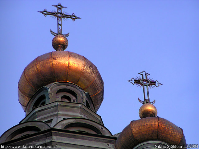 Helsinki: Uspenskin katedraalin kupolit Katajanokalla auringonlaskun valossa.
