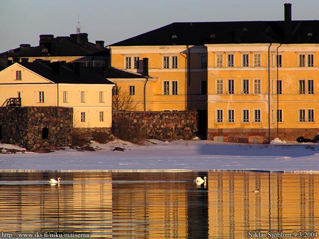 Helsinki: Merisotakoulun rakennuksia Suomenlinnan Pikku Mustasaaressa ja joutsenia Särkänsalmessa näkymässä Särkän saaresta.