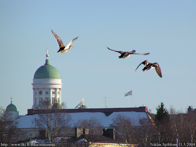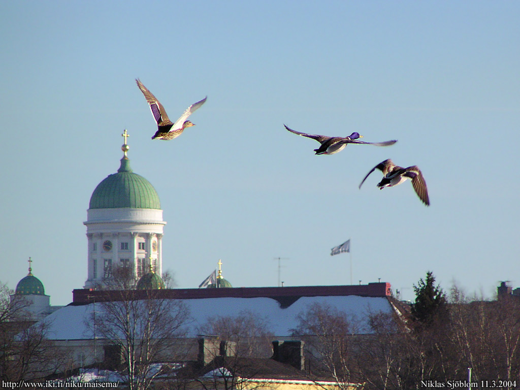 Helsinki: Sinisorsia siivillään Eläintarhanlahden yllä; takana Tuomiokirkko.
