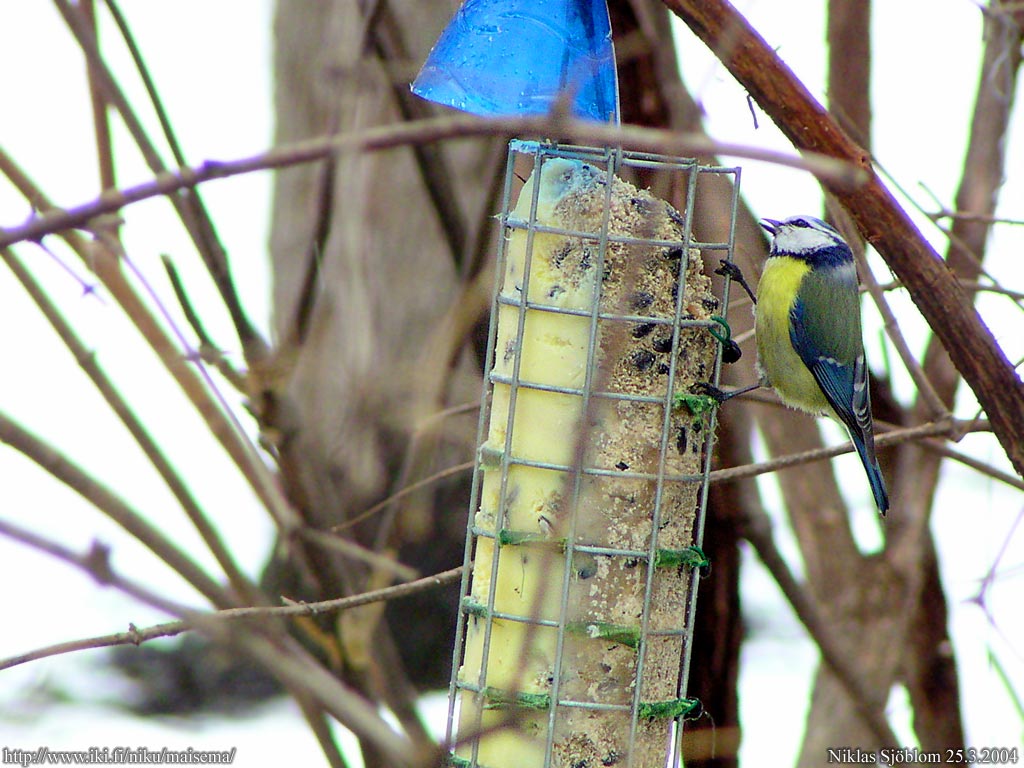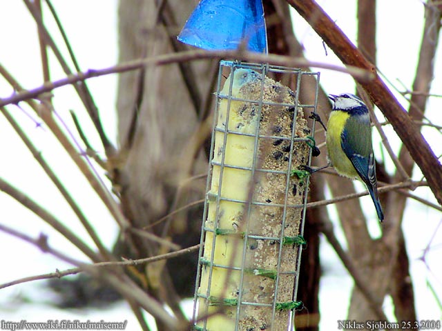 Helsinki: Sinitiainen herkuttelemassa Topeliuksen puistossa Taka-Töölössä.