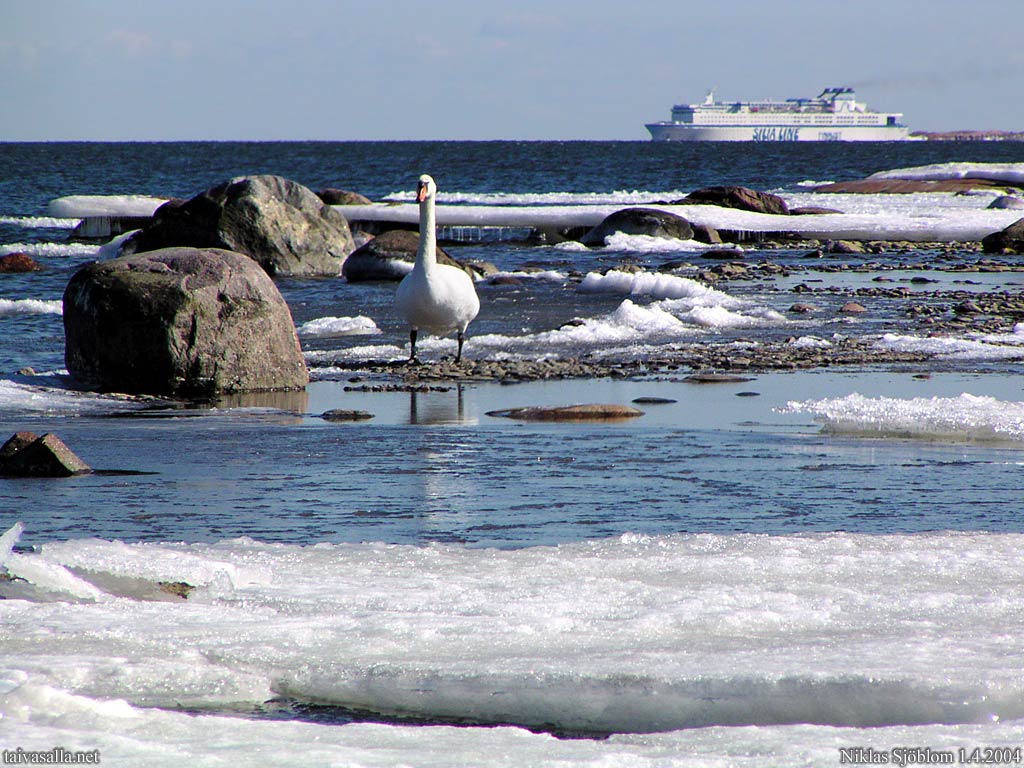 Helsinki: Kyhmyjoutsen ja Helsingin satamaa lähestyvä M/S Finnjet; näkymä Lauttasaaren kaakkoisrannasta.