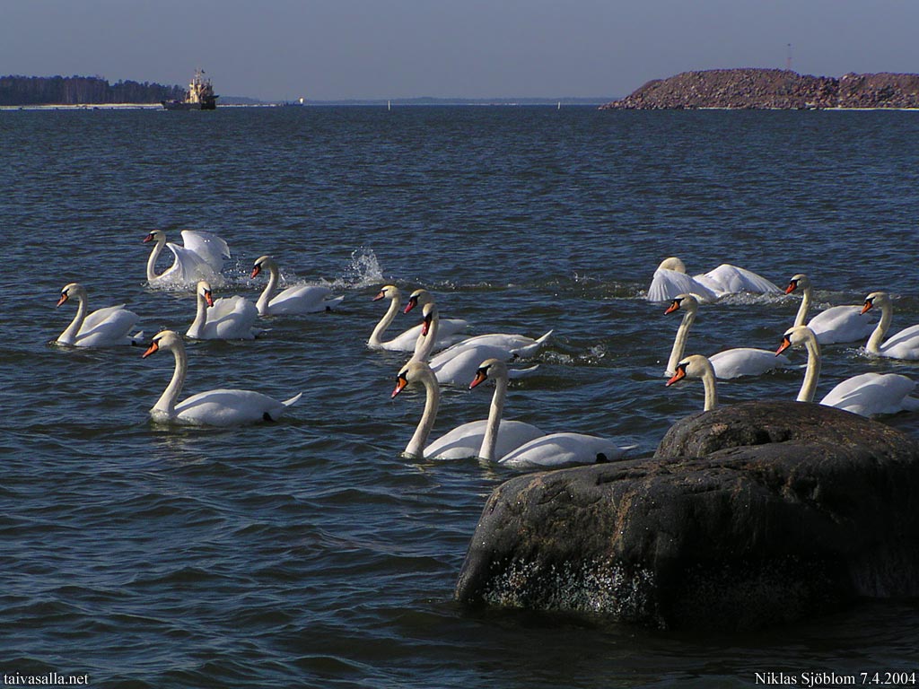 Helsinki: Kyhmyjoutsenia Liuskasaaren rannassa. Taustalla vasemmalla Pihlajasaari ja oikealla Hernesaaren kärki.
