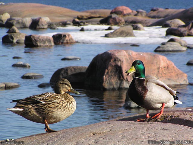 Helsinki: Sinisorsapariskunta keskustelee Lauttasaaren kaakkoisrannassa.