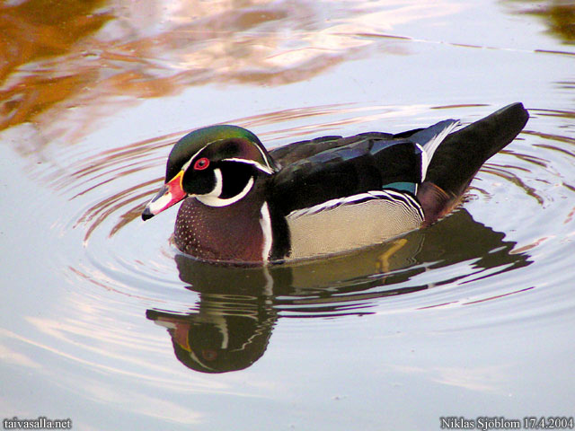 Kotka: Morsiosorsakoiras Sapokan vesipuistossa. Pohjois-Amerikasta kotoisin olevat morsiosorsat ovat Suomessa harvinaisia. Tämä ainoa yksilö lienee tullut Brittein saarilta.