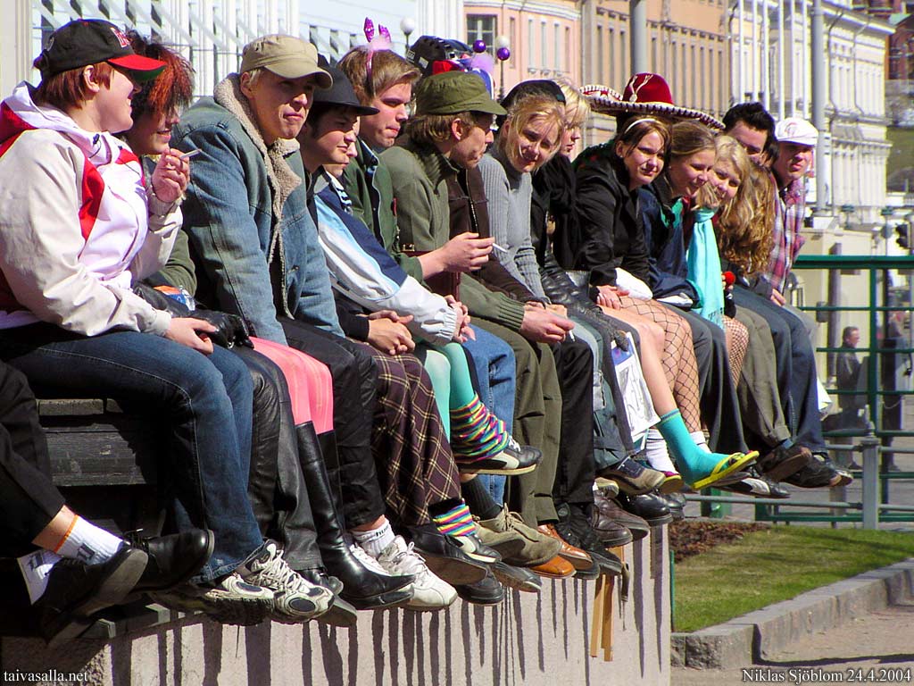 Helsinki: Nuorisoa istuskelemassa esiintymislavan reunalla Esplanadin puistossa.