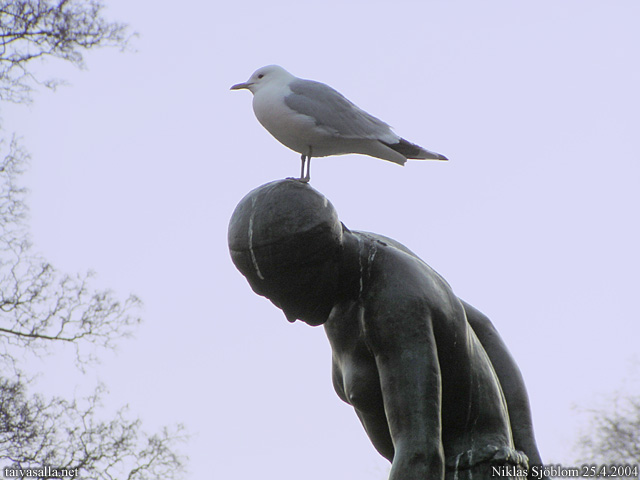 Helsinki: Lokki katselee hämärtyvää iltaa Vedenkantajan, Viktor Malmbergin vuonna 1923 tekemän veistoksen päällä Katajanokan puistossa.
