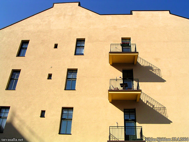Helsinki: Vyökatu 9 Katajanokalla. Talon etelänpuoleinen seinä kunnostettiin talvella, jolloin siihen tehtiin uusia ikkunoita ja parvekkeita.