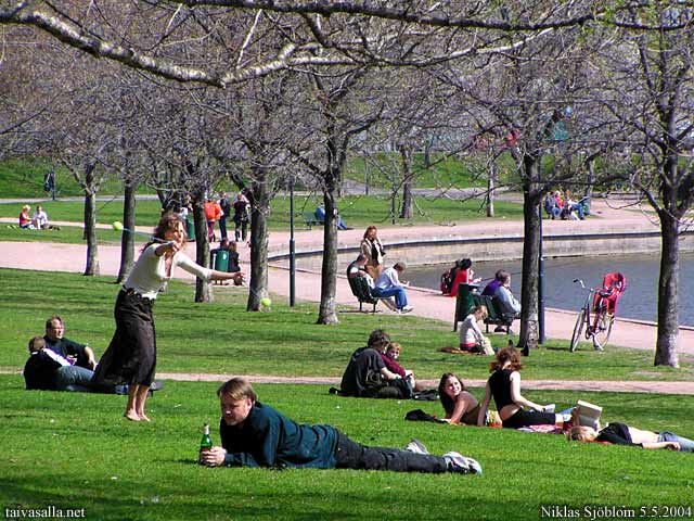 Helsinki: Lämpimästä kevätpäivästä nautiskelijoita Tokoinrannan nurmella Eläintarhanlahden rannalla. Päivä aloitti poikkeuksellisen lämpimän kevätsään jakson.